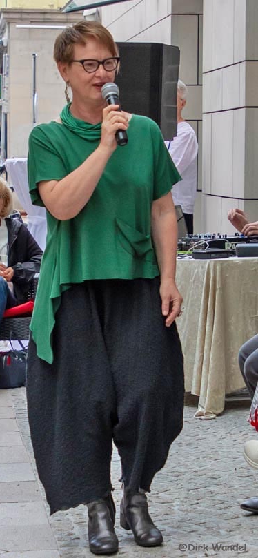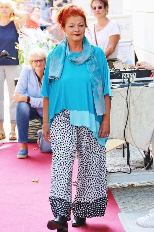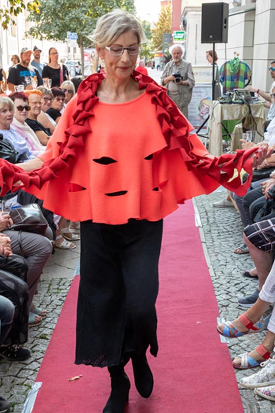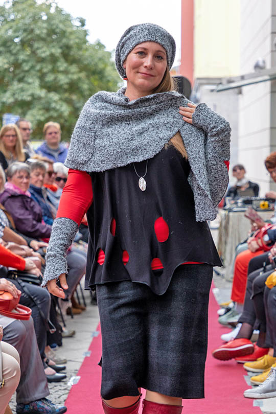 Ergänzt wird die Mode durch von mir gefertigte Accessoires wie Mützen, Loops, Armstulpen und Schals, handgefärbte und gestaltete Seidenloops und Seidenschals.